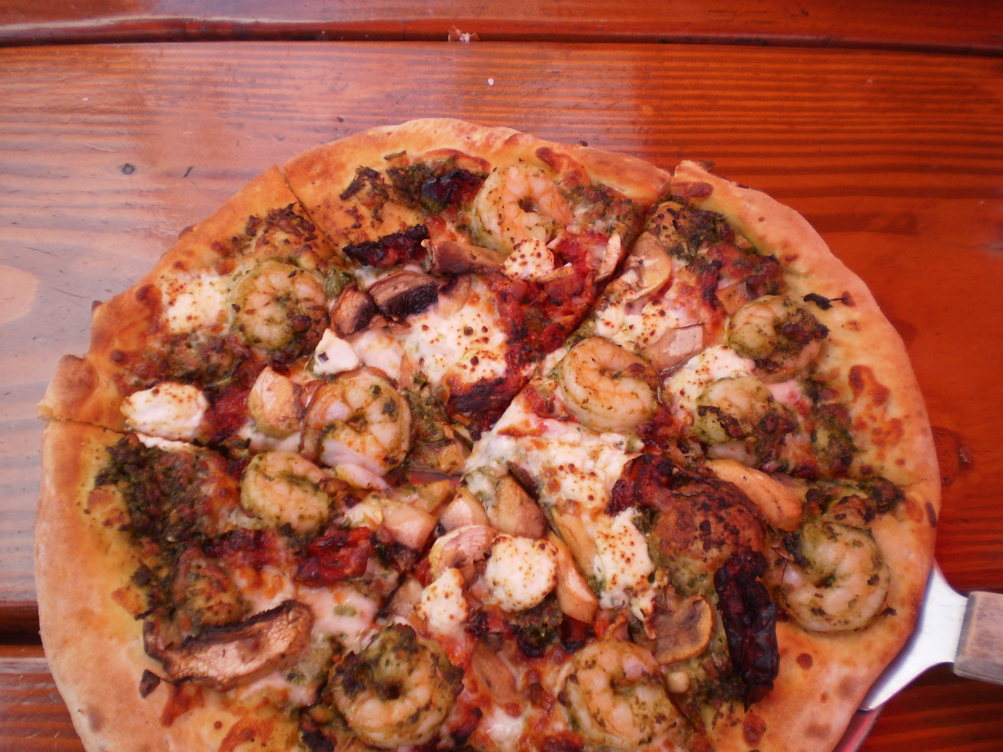 Jana grew up in Southern California and likes to live in bathing suits during the summer so, of course, she’s a Beach Boys fan. Our main course was the Surfin’ Surfari Shrimp Pesto (Yes, it is spelled Surfari) which is $13.95 for a 10-inch individual sized pizza or $22.95 for a 16-inch family sized pizza. For $1 extra (individual or $2 for family) you can even get it gluten free. The crust is thin, crispy and hand-tossed. This pizza is a wonderful blend of house-made pesto, shrimp, mozzarella and goat cheese, mushrooms and sun-dried tomatoes. Large pieces of shrimp decorate the top in abundance.