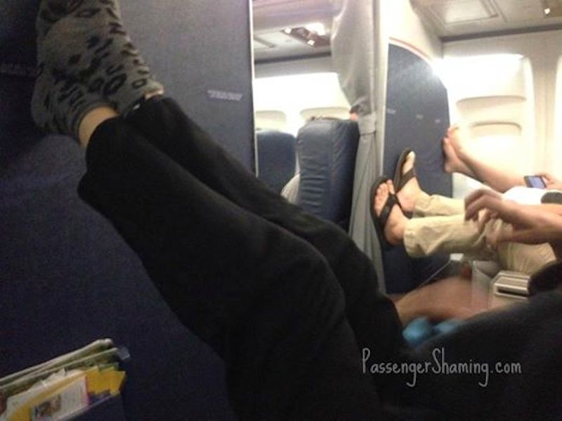 Another person has simply taken his or her shoes off and doesn’t have feet on the food tray or anything but the floor, but this is shameful because of the clothes? Or because someone has something against bare feet?