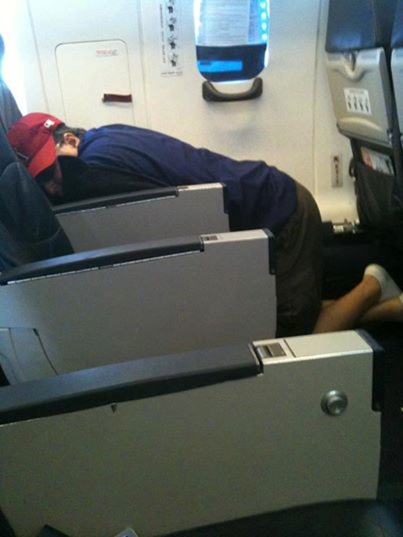One gentleman isn’t bothering anyone, but he does have his head into his OWN headrest. One person noted that while it didn’t look comfortable the passenger got two things rights–he’s using his own headrest and no one is next to him. Another person wrote, “He is just trying to get some sleep.”