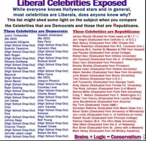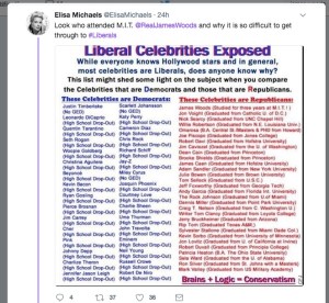 Yesterday morning I saw this missive on @RealJamesWoods Twitter account. The post doesn’t originate from actor and die-hard Republican martyr James Woods, but he was glad to share it. The purpose is to show the intellectual superiority of Conservatives over Liberals, confusing Democrats with liberals and Republicans with Conservatives while spreading misinformation.