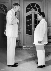 And what could be more humiliating than losing a war to a race considered inferior, to men considered inferior to both white men and black men? If the photo of the then-Emperor Hirohito with Douglas MacArthur at the end of World War II and the beginning of the American Occupation reinforced a racial hierarchy and the notion that bigger is better, the photo of Ho Chi Minh, a full head shorter than the OSS officers (e.g. Carleton Swift) who saved him in 1945, was a contradiction.