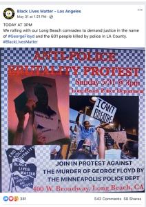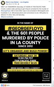 The peaceful march on Tuesday afternoon (2 June 2020) was not publicized on the Black Lives Matter-LA Facebook or Twitter landing pages.