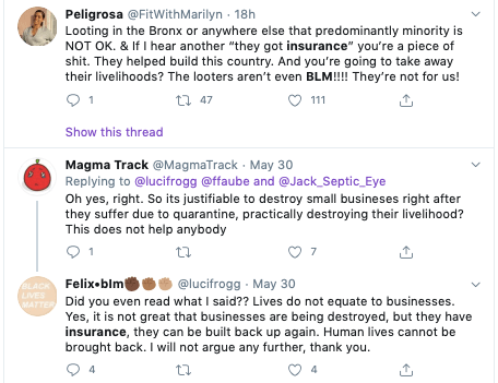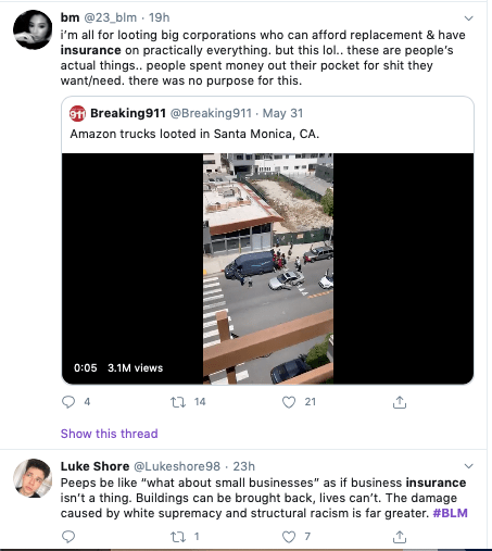 Some people on Twitter justify or shrug off the destruction because those businesses must have insurance.