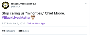 This person didn’t get the notice that at least the Twitter account of Black Lives Matter-LA doesn’t like the word “minorities.”