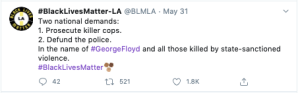 If an organization wants change and wants the US society to be concerned about justice, then it must want justice for all peoples. We must want just treatment for Target and mom-and-pop stores and the LAPD. In 2020, to prevent damage to the community, organizations must work with the police. Instead, Black Lives Matter-LA turned the topic of looting to be about their agenda. The Black Lives Matter-LA Twitter account reposted examples of vandalism (tagging) which seems more like support or encouragement than a denouncement. The chanting of “Eat the rich” and “F*ck police” suggests neither peaceful nor constructive objectives and neither motto has anything to do with George Floyd.