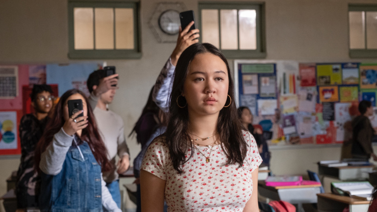Once Joey successfully retrieves the condom, she throws it in front of Leila Kwan Zimmer (Amalia Yoo). It’s just a “joke,” but Leila is already the source of much negative attention from the “real” Chinese girls in her classes. We later hear the Chinese girls make snide remarks in Chinese (subtitled in English) in history class where Leila, a freshman, will be writing about the Jews in China. Her adoptive parents are Jewish, but she is Chinese without a cultural reference. Leila’s true feelings of frustration and anger are represented by animated sequences that aren’t pretty and often involved zombies and the ripping of flesh.