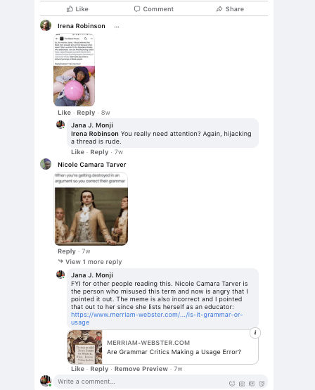 I noted that the proper Netiquette is to comment on the post and not to attempt to change the topic of conversation. That didn’t deter these two. As I already knew that ignoring these trolls did not help, I used the FB feature that hides the comment. During this time, I did research on trolls and cyberstalking; because photos were taken from my social media accounts and reposted to subject me to ridicule, I made my Instagram private. During Thanksgiving and the various December holidays, most people have something better to do on. holidays. Certainly, I’d be busier except that the pandemic closed down many events. The tag “team” of Tarver and Robinson got lonely if I ignored them. There were denigrating comments on my appearance, specifically my breasts, and my fertility. If a man had written those statements, I’d think he was a picturing himself as a jilted lover and hoping that I send him some soft porn amateur hour photos to prove him wrong. Because my husband didn’t defend me or “like” this particular post (a video of dancing), he was denigrated and his masculinity questioned in a manner that seems racist or sexist or both.