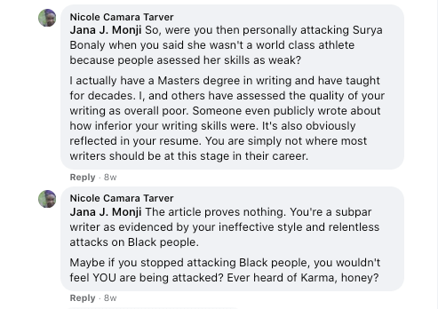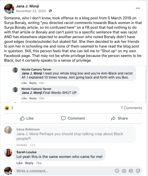 Yet two comments by the same account, one that is nothing but a placeholder opened in 2017 without any actual blog entries is unusual, particularly when the comments are made on the same day. I soon found a single word comment on my Instagram which was then public: “racist.” The comment from Quirky Brown Chick was totally unrelated because I publish photos of food, face masks, dogs and events. I blocked Quirky Brown Chick. That is the advice one is given about trolls. Quirky Brown Chick on Instagram does have some content and her account links to her YouTube account. Now I have a face, but not a name. I’m not interested in knowing more. I would have gone on and forgotten about Quirky Brown Chick except there was a comment on a totally unrelated post on my personal Facebook page that referenced Surya Bonaly from Nicole Camara Tarver. And soon enough Irena Robinson joined in. Robinson’s FB account also seems like a placeholder. Tarver had other posts. I could not post on Robinson’s account and would not have because I also did not post on Tarver’s account. In any case, at this point, I have two faces and two names. I know from Instagram and YouTube that Tarver is Quirky Brown Chick thanks to the profile and cover photos. I did not watch her videos because that would be feeding a troll. Don’t encourage bad behavior.