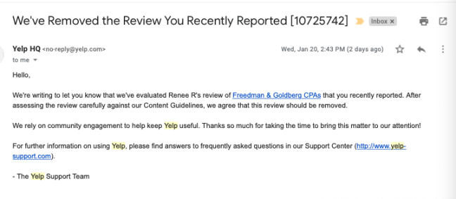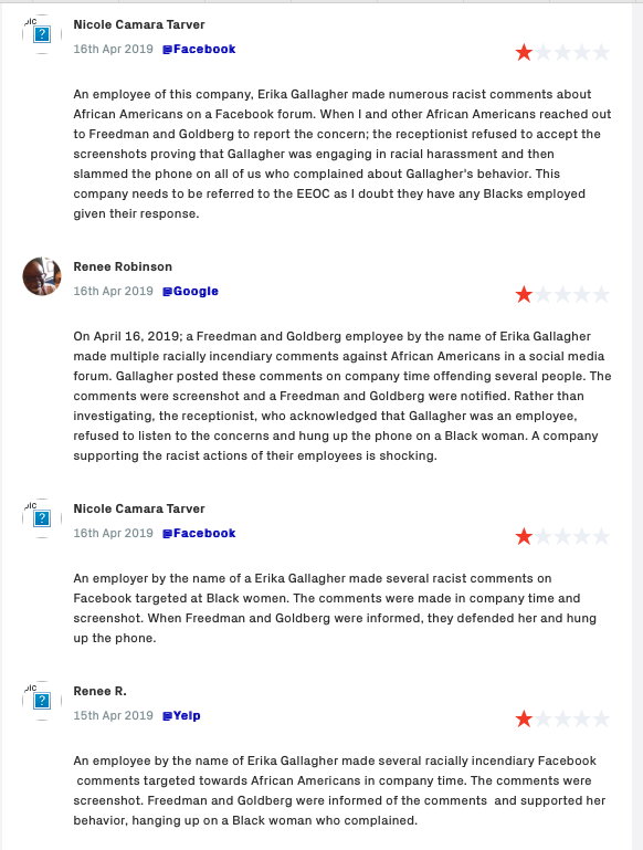 I found that Tarver had had an altercation with someone named Erika Gallagher who worked at an accounting firm in another state Michigan. So she and Renee Robinson decided to use these claims to write a review for the company where she worked. That is a violation of Terms of Service and can one really believe anything that Tarver and her tag team write? In any case, like any good Netizen, I asked to have these reviews removed.