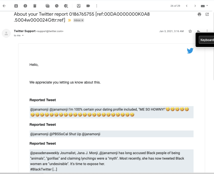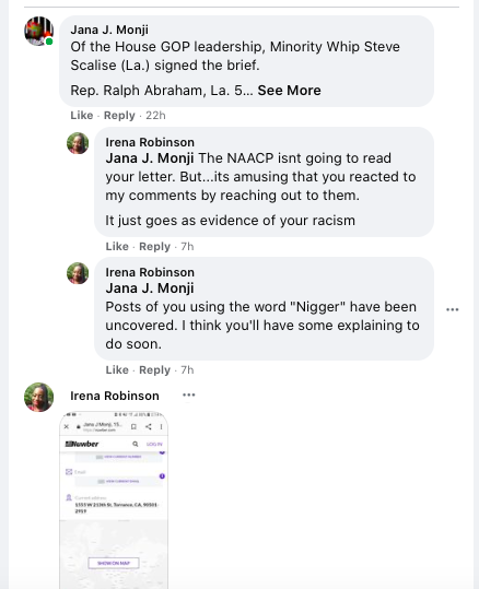 In my case, she introduced herself to my friends on Facebook and attempted to tell them things about me. She attempted to get the Pasadena Weekly, where I sometimes freelance, to reconsider using me in a public tweet on Twitter. As you can see above, I was publicly accused of comparing Black people to gorillas and using the N-word. Photos of me were posted without any attempt at fair usage or commentary, but rather to ridicule me.