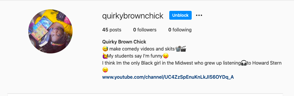 She filed a DMCA with Google to have them stop searches to my post about my research on trolls and her trolling even though all of her posts were on public forums. None were taken from private posts. Neither Tarver nor Robinson are my Facebook friends. Nor are they my friends on Instagram or Twitter. The photos she uses for her profile are her public face and the only means of identifying her and, prior to the DMCA notification, the only means I had to connecting her Quirky Brown Chick Instagram (which is connected to her Quirky Brown Chick YouTube) to her Facebook account under Nicole Camara Tarver and to connect Tarver to Belle McWhite.