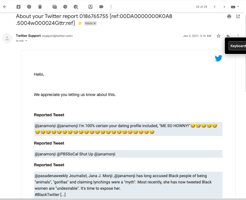 Because I tweeted a screenshot of Twitter’s official response to my report on Belle McWhite, I also know that Nicole Camara Tarver is Belle McWhite. Tarver asked Twitter to take down the tweet because she felt usage of her profile photo was copyright infringement. In her response, she had to use her real name so Belle McWhite is indeed Nicole Camara Tarver. That was only this month that I got legal evidence of this.