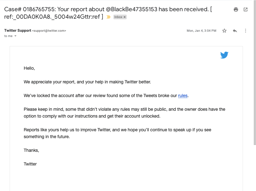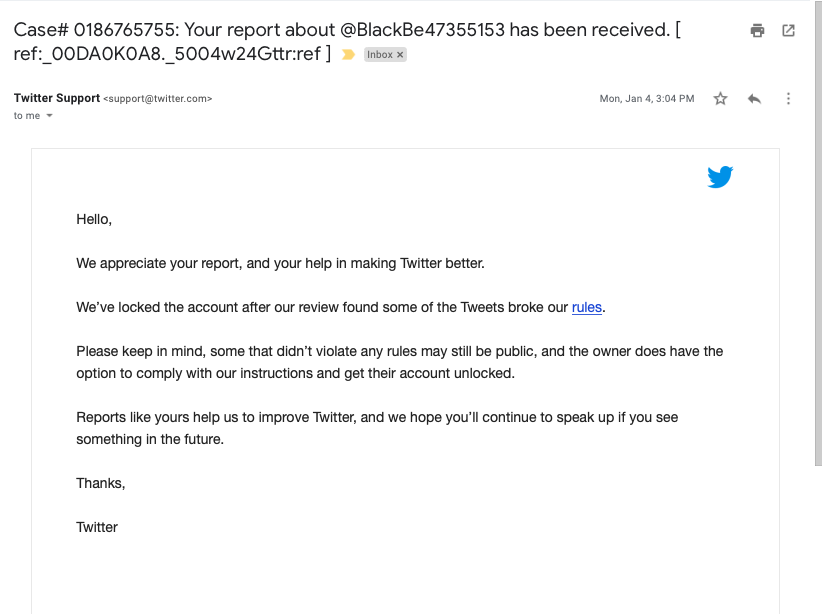 I had already blocked Belle McWhite (AKA Nicole Camara Tarver), having already blocked Irena Robinson and yet I reported another account on 3 January 2021: In this Twitter account @BlackBe47355153 (The Revolution Will Be Televised) the individual was both racist and claiming I was racist. She quoted that prostitute’s line from the 1987 “Full Metal Jacket.” That account was locked due to TOS violations.