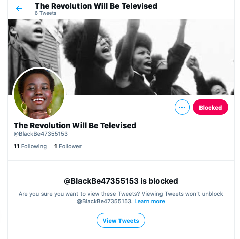 But notice that the photo used in that Belle McWhite tweet of an attractive Black woman is the same photo used for the profile photo of @BlackBe47355153 (The Revolution Will Be Televised) Twitter account.