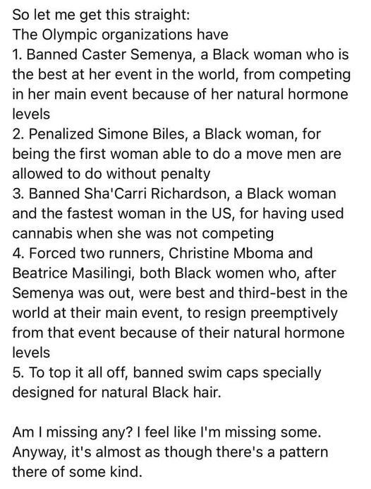 Moving on to Caster Semenya of South Africa, a two-time Olympic gold medalist who, like Namibian athletes Christine Mboma and Beatrice Masilingi, is affected by an IAAF rule change, we have to look back into history to see if it really is about them being Black. For the 30-year-old Semenya, this might mean she won’t make another Olympics. There’s still time for the two 18-year-old Namibian athletes.