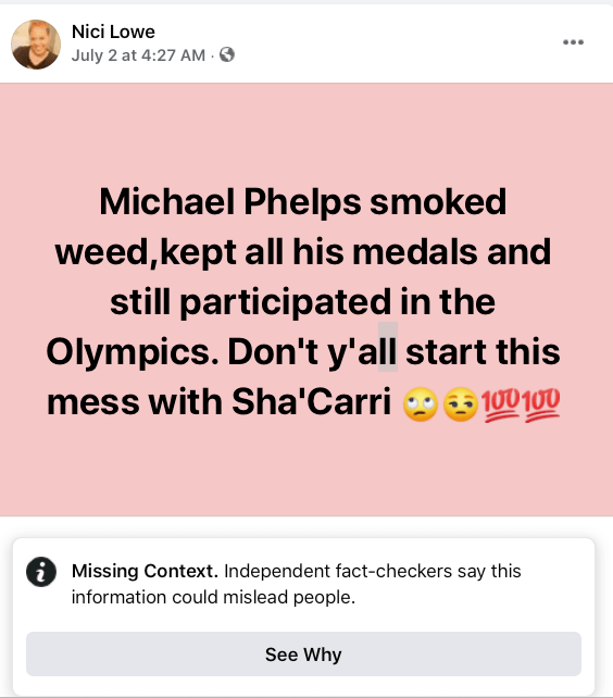 Let’s start with the easiest one: Sha’Carri Richardson. I don’t follow track, but when I initially saw a photo of Sha’Carri Richardson, I thought she seems cool–someone to bring glamor back to track because although I don’t like long nails, I did like Flo Jo’s style. But Richardson failed a drug test. She’s not the first one to fail a drug test and one of those people who was penalized for use of marijuana was Michael Phelps although not for the Olympics.