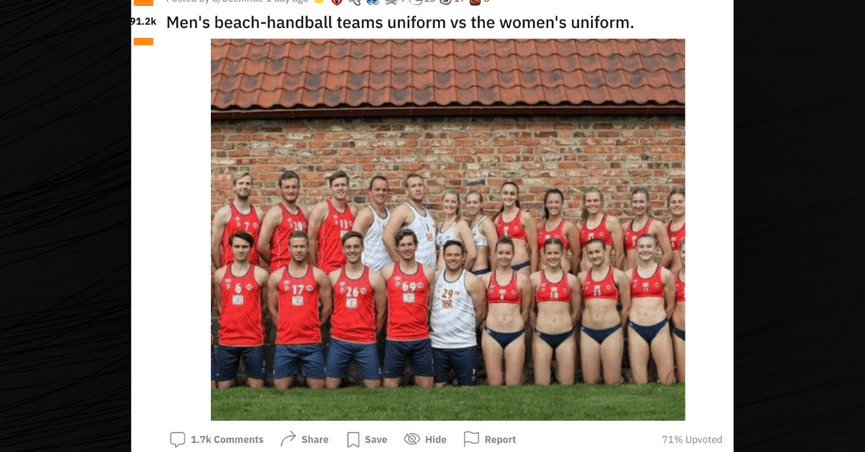 To put this all in perspective with how the sexualization of women has been normalized, let me leave you with a comparison of the men’s and women’s handball team uniforms and a meme about equity in bodily exposure.