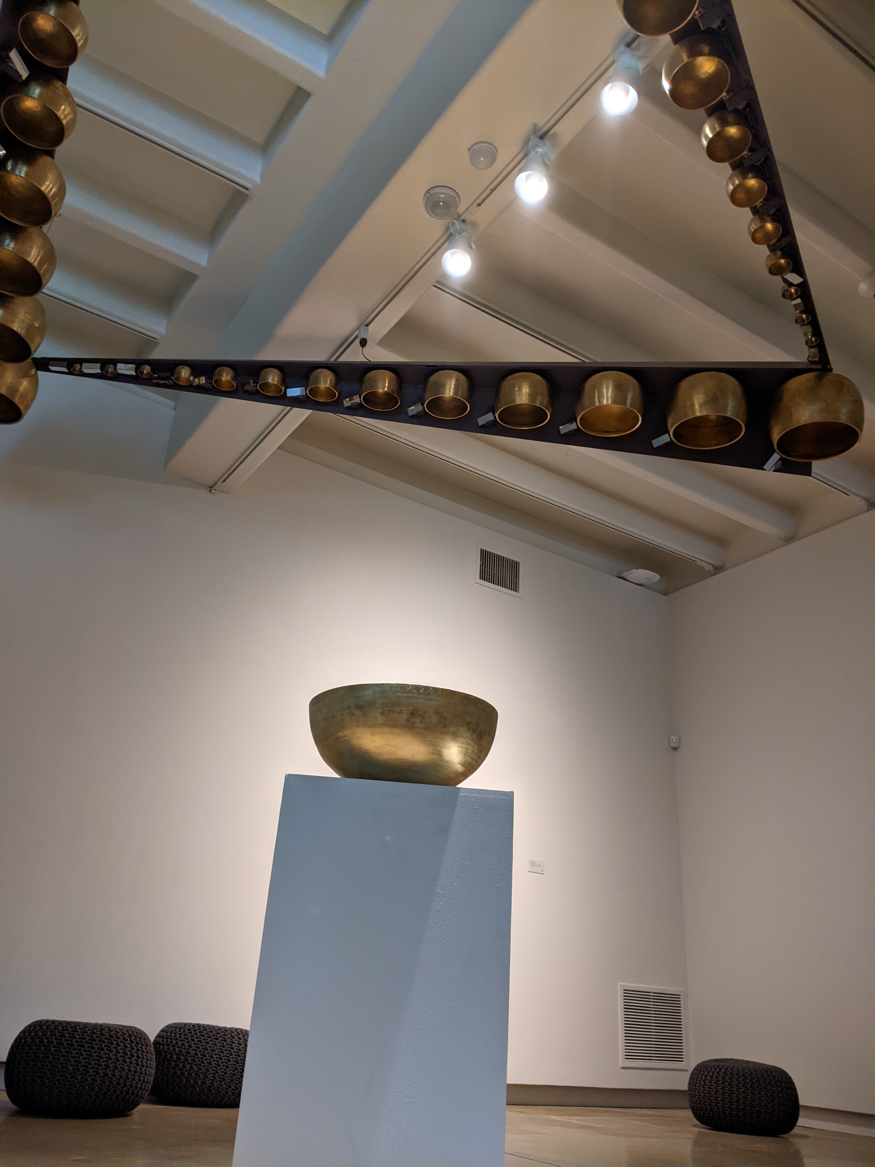 “Immersion” is a kinetic sculpture soundscape. You can sit down and explore quiet against sounds that begin with the soft hammering of a metal bowl. You can even find a type of “Heaven,” that reflects and changes your own image. “Becoming Horizon” is kinetic sculpture with dancing light and music.