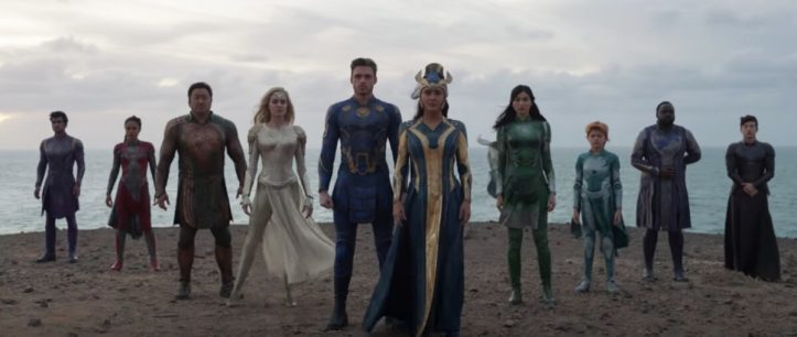 The image below that has Gemma Chan (as Sersi) highlighted only works because the color of Angelina Jolie’s Thena costume has been dimmed from a white to a pewter silver and the color of Lia McHugh’s Sprite has been changed from bright blue to at green that matches Chan’s costume. The sun setting behind them also directs the eye to the center.