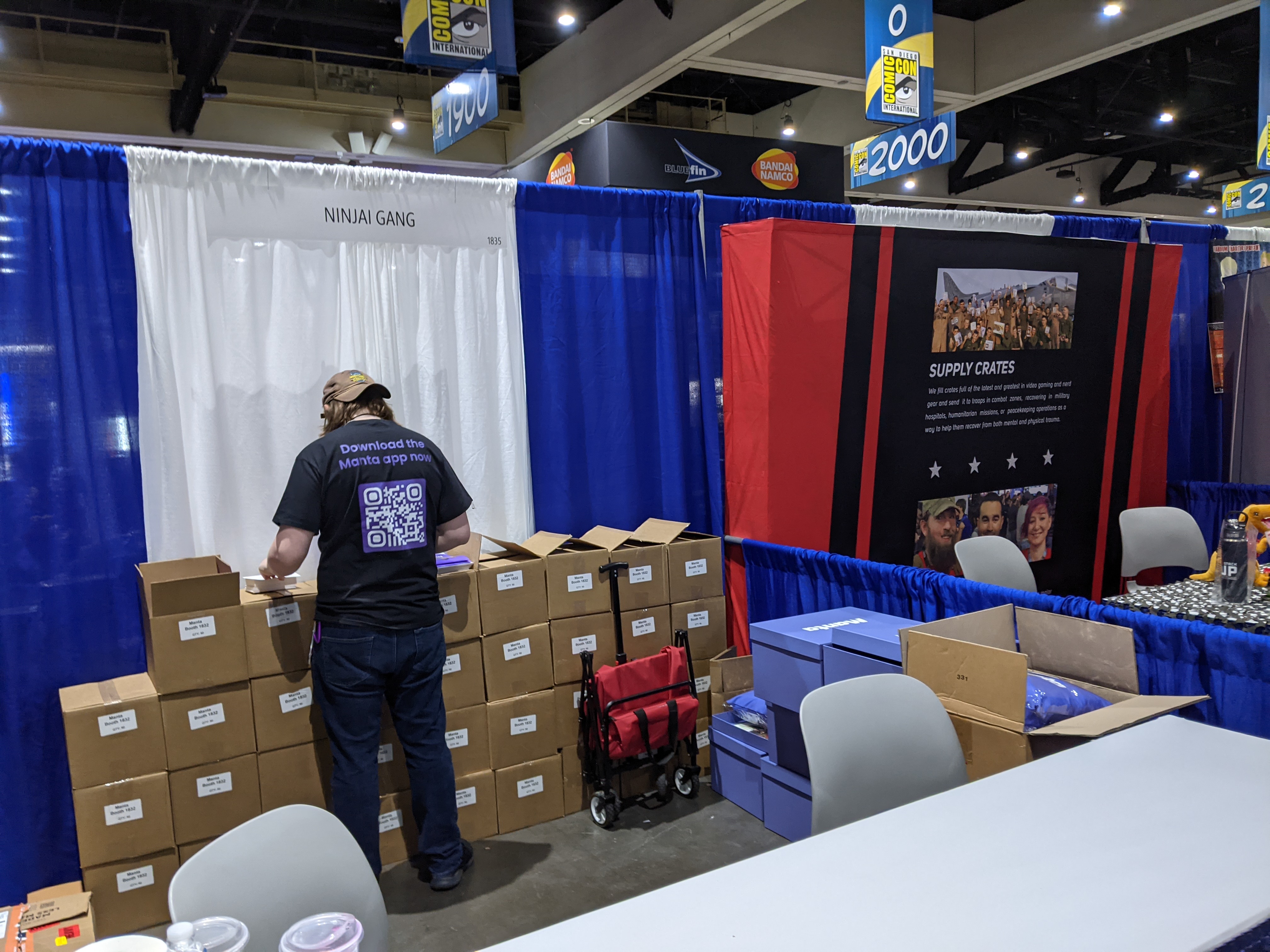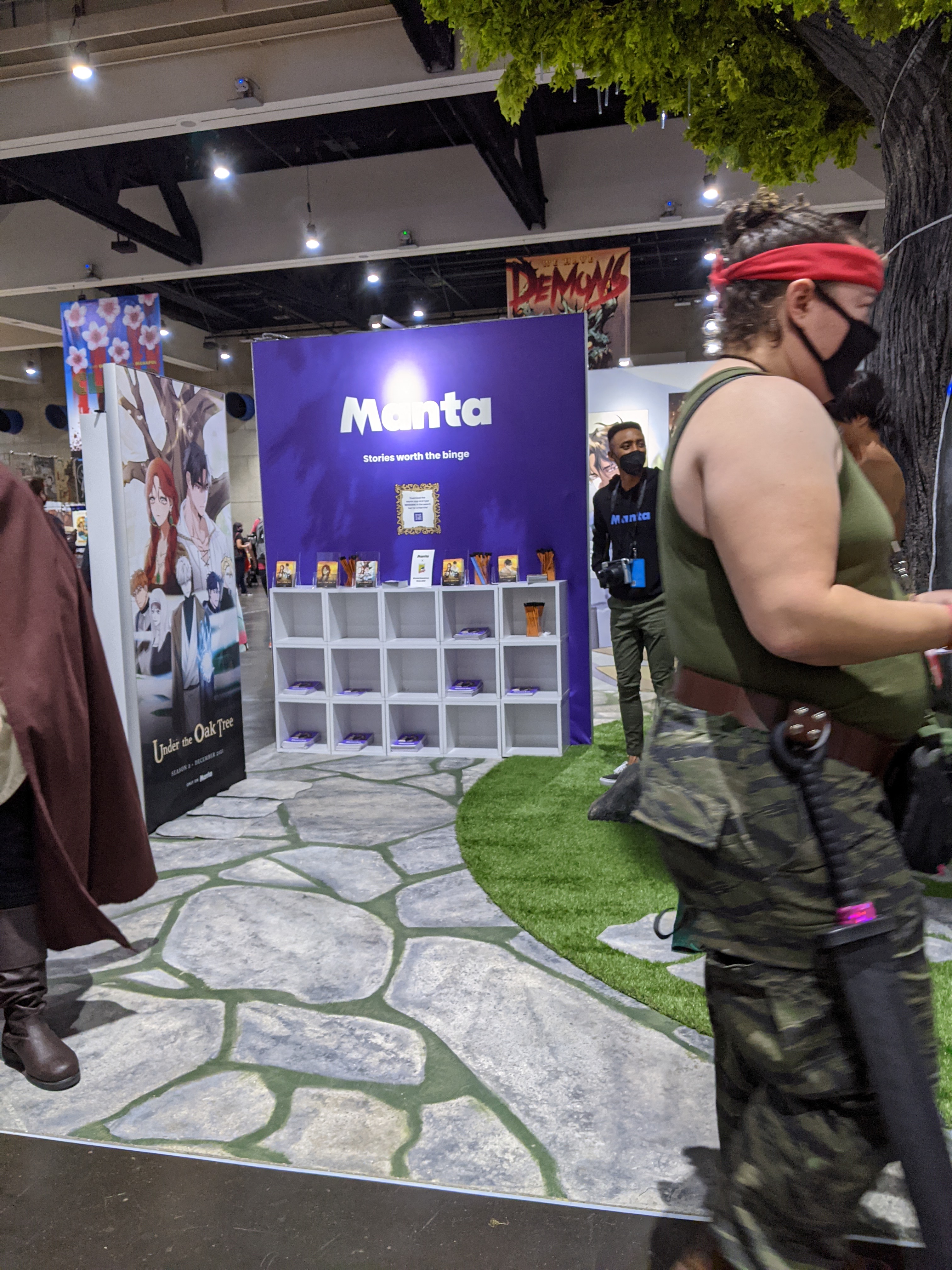 After a morning driving down to La Jolla and running the dogs in a new competitive sport, we boarded them at PetsMart and headed over the SDCC Special Edition. I’m always on the look out for freebies and we passed many empty stalls including one that was being used for storage. I waited and asked how to get a free blue pillow and was sent over to the Manta Comic “Under the Oak Tree” booth.