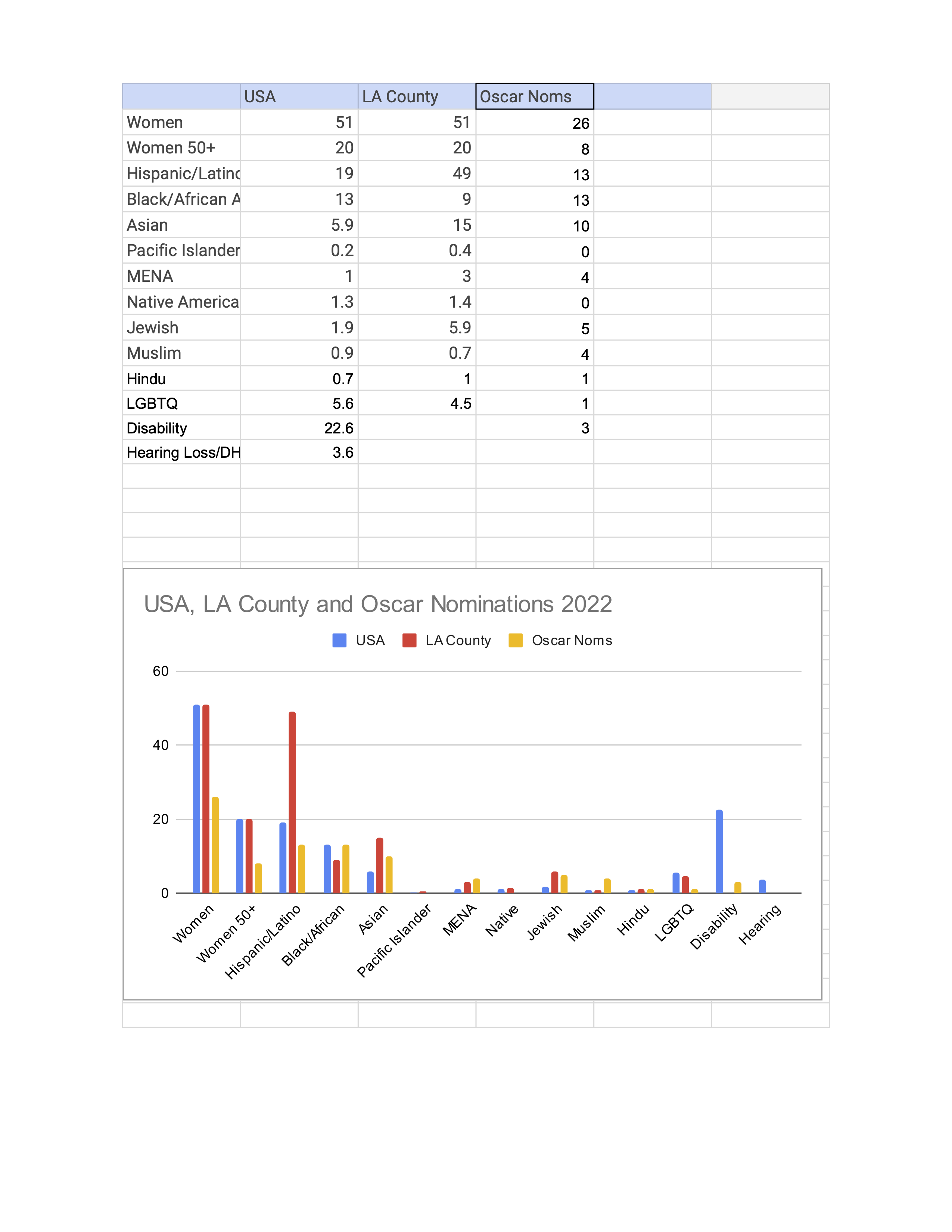 Out of 10 films, only two have female leads, (“CODA” and “West Side Story”) with 20 percent representation as opposed 51 percent. In both cases, that actress was not nominated. Latino representation (“West Side Story”) is 1 out of 10 as is Asian (“Drive My Car”) and Black/African American or 10 percent. Disability representation is 1 out of ten for 10 percent. That would mean Latinos are still under-represented. Nationally, Latinos are 19 percent of the population, but 49 percent of Los Angeles County. African American/Black are close to the 13 percent nationwide or the 9 percent in Los Angeles County. Asian would be over represented for nationwide (5.9 percent), but near the Los Angeles County population (15 percent).