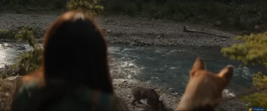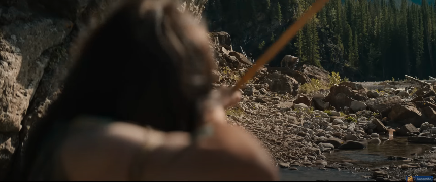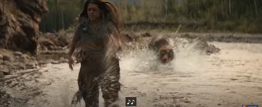 Naru continues to track and finds a bear eating a dead deer. The wind shifts and still, Naru decides to shoot the bear. And the bear must not be that hungry because it leaves its meal and sniffs around and knows exactly how to get up to where Naru is. Naru could be running away, but tries to restring her bow. Her dog barks and doesn’t bait the bear, but simply runs away and the bear, despite being so close to what it was smelling (Naru), decides to pursue the moving object (Sarii). Naru runs after them, but Sarii then runs back and past Naru. At which point, Naru shoots an arrow and then takes refuge in a beaver dam. Sarii has disappeared, but luckily, the Predator saves Naru by slaughtering the bear. You might be asking, as we did, where is Sarii? Why doesn’t Naru run from the bear when she has the chance and look back at the bear from afar?