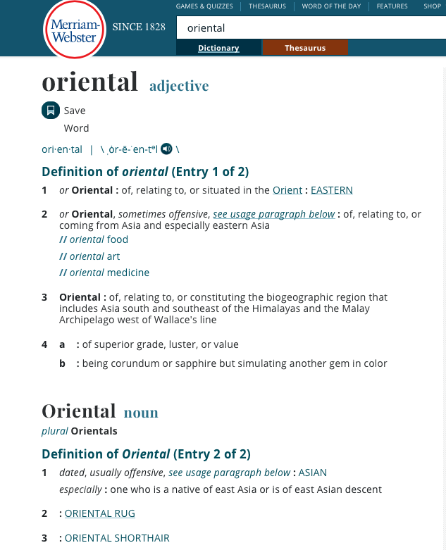 Merriam-Webster states is pertains to Asia, and usually East Asia. The Orient, however, at one time covered North Africa, Asia and the Pacific Islands. The University of Oxford’s Oriental Institute, was renamed the Faculty of Oriental Studies but as of 1 August 2022, changed its name to the Faculty of Asian and Middle Eastern Studies. North American colleges and universities made the change earlier. The International Congress of Asian and North African Studies, changed over from its original 1873 name (International Congress of Orientalists or Congrès international des orientalistes) to International Congress of Human Sciences in Asia and North Africa in 1976 and then to its current name in 1986.
