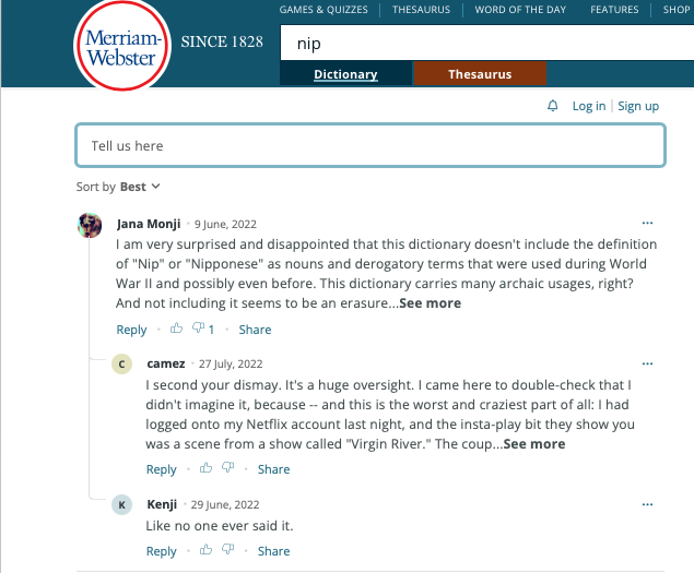 A good language teacher would have warned students of the potential for a word to be taken as an insult. Researching usage of the word “Nip,” did afford me the opportunity to note that my go-to online dictionary, Merriam-Webster, didn’t consider anti-Asian sentiments that resulted in a force relocation of thousands. Merriam-Webster does not include the derogatory meaning in its definitions. That was a major disappointment.