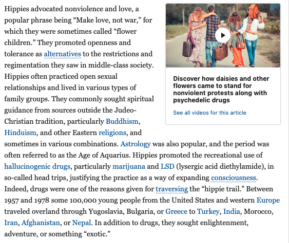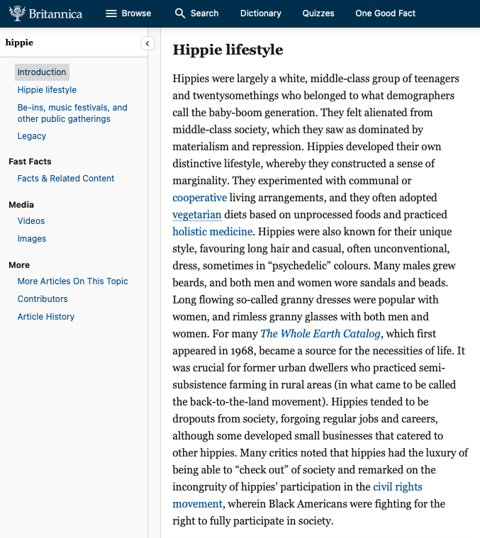 However, if you look at Britannica, the definition is more concise than Merriam-Webster. The hippies were predominately White and middle class.