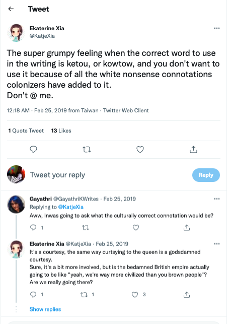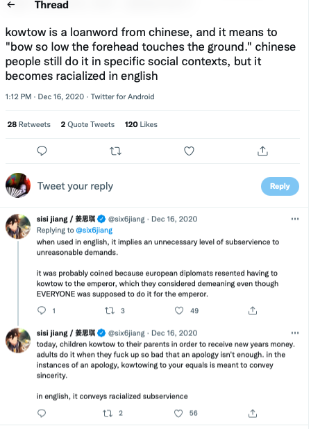 Because the phrase came into English during a time of imperialism when a great sense of White superiority permeated national politics of European and North American countries, I feel the negative connotations of kowtow, is a relic of anti-Asian sentiment in English-speaking countries. When people were knocking their heads on the ground in front of me, even though I am not a Chinese or Japanese emperor, I was both startled and honored. As I mention above, I also did not feel the practice of bowing with foreheads to the ground as presented in the South Korean drama had anything to do with a fawning attitude. When English-speaking people use the phrase “kowtow” in English, I cringe and I am not alone.