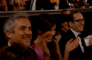 Oh notes that “A Star Is Born” (4:17) is nominated for Best Motion Picture -Drama (4:21) and names the stars: Bradley Cooper and Lady Gaga. Then Oh seems serious when she says there could be 99 people in a room and if just one believes in you like Cooper that makes a difference and then, Samberg, acting like the totally unaware male chauvinist rephrases what she has just said. Lady Gaga reacted and the smiles from those Cooper and Lady Gaga were just beautiful.