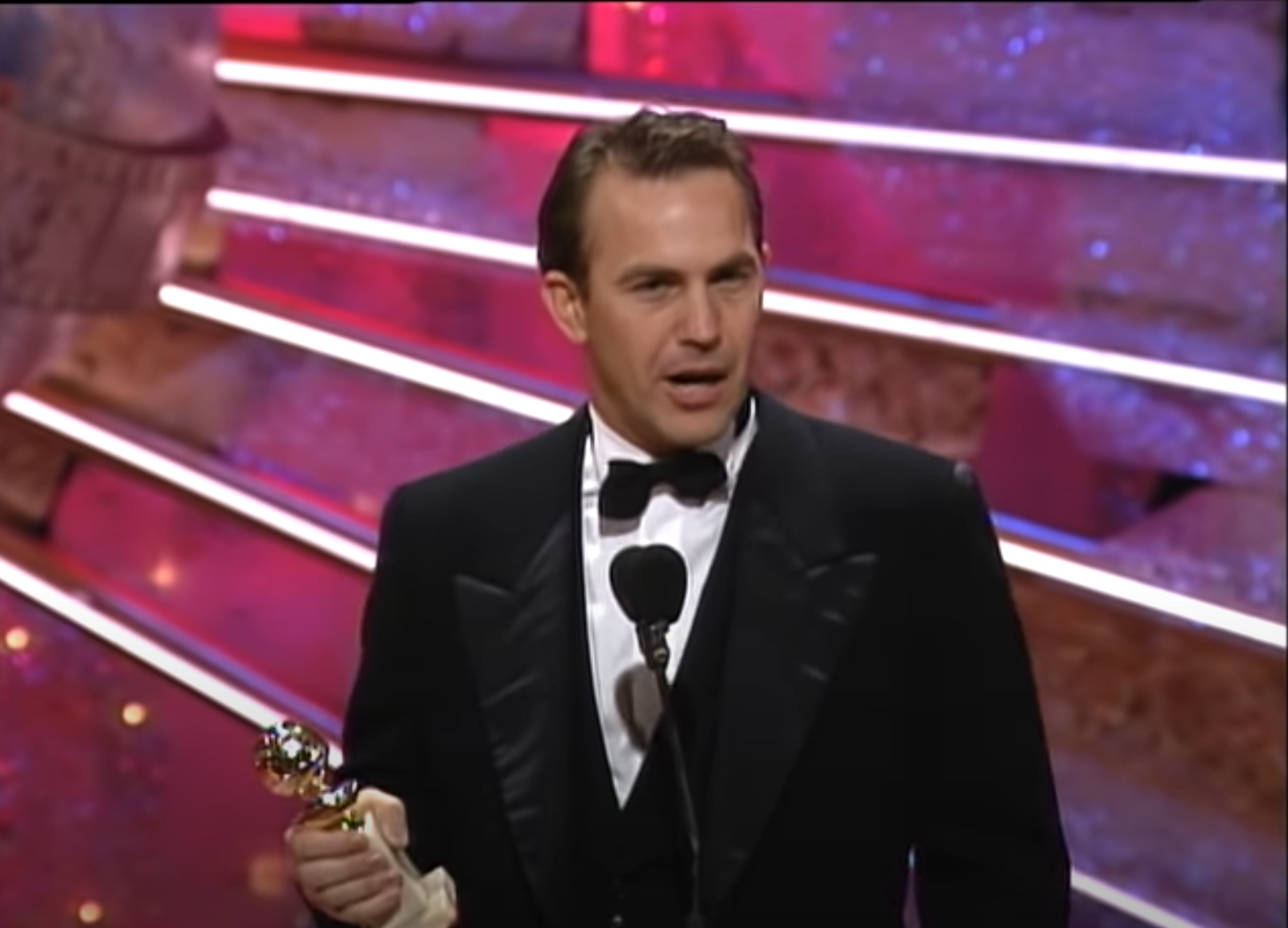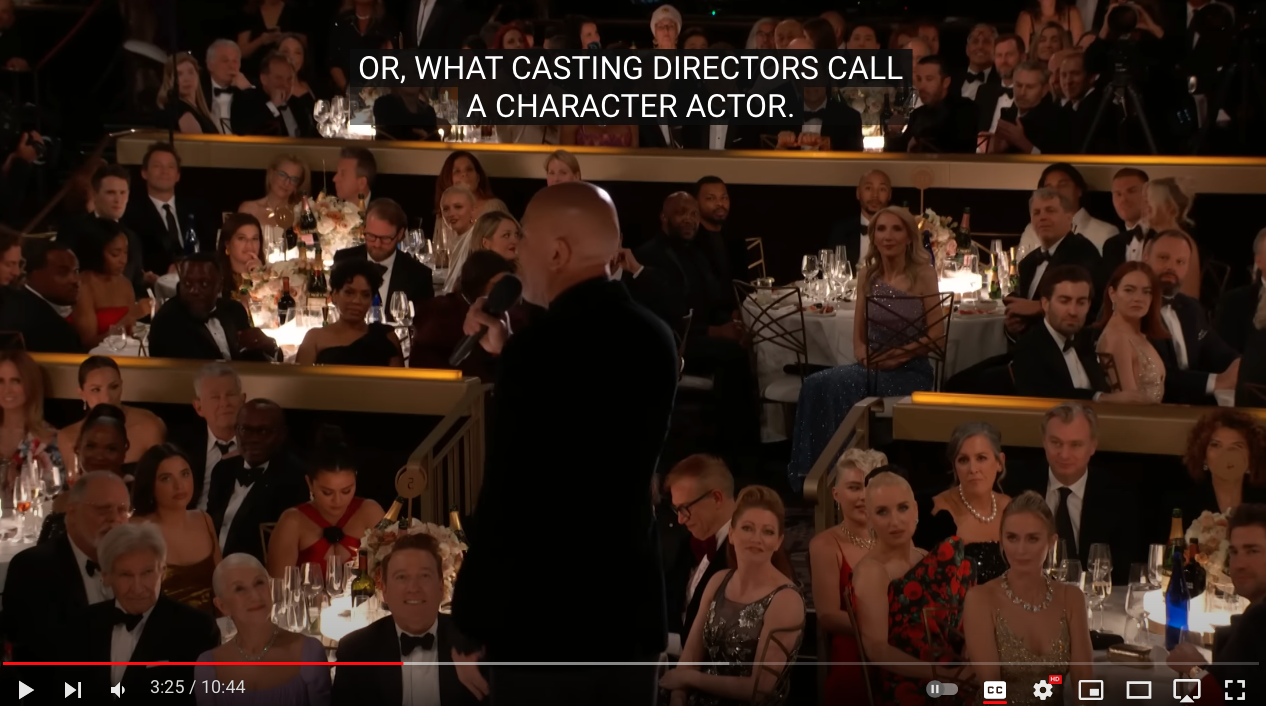 Jo Koy begins well with telling the audience what it is (81st annual Golden Globes) and who he is, but not where he is. Then he begins to talk about himself, “This is a dream come true” and adds, “not just for me, but for everybody in here.” He tells the audience, to look around. Then the first celebrity he mentions is Kevin Costner (0:26). This makes no sense, because for Costner, this isn’t a dream come true. He’s been there before and won. Jo Koy then makes a joke based on something that is untrue (that Costner never shows up), but missed a joke about commuting. Costner did attend at least two other Golden Globe ceremonies, but in 2023, he could not attend due to flooding.