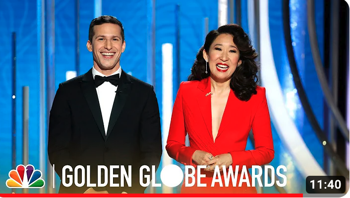 They quickly set up their next joke, saying with “Andy Samberg and Sandra Oh, the two nicest people in show biz” hosting, “This thing’s gonna be a snooze,” Samberg begins. Oh quickly comes in, “But not so fast, because you fools are all about to get roasted.”