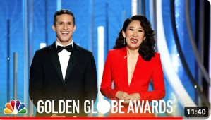 In the first five minutes, Oh and Samberg were able to address recent issues (Kevin Hart), give nods to three of the five films nominated for Best Motion Picture – Drama (“Black Panther,” “BlacKkKlansman” and “A Star Is Born” but not “If Beale Street Could Talk” or the eventual winner “Bohemian Rhapsody” ) and two of the five films nominated for Best Motion Picture – Musical or Comedy (“Crazy Rich Asians” and “Vice” but not “The Favourite,” “Mary Poppins Returns” or the eventual winner “Green Book.”). The opening gives the first and last names of 13 names people (except for Lady Gaga whose real name isn’t used). They also address two important issues: historic violent racism toward the Black Panthers and Hollywood’s whitewashing. The full opening is 11 minutes and 39 seconds.