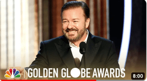 Rickey Gervais hosted the Golden Globes five times. He quickly announces that “this is the last time, I don’t care any more. I’m joking I never did.” But he also notes that Kevin Hart fired from the Oscars and “Let’s have a laugh at your expense, we’re all going to die soon and there’s no sequel.”