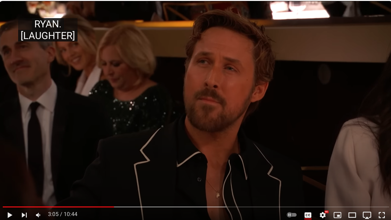 Making sex jokes is risky, but then making jokes about a doll’s breasts and a real man’s penis is barely disguised locker room humor and fails to recognize the achievement of the director and co-writer (with Noah Baumbach) Greta Gerwig whom he doesn’t name when talking about “Oppenheimer” and “Barbie” (2:31). To be fair, Jo Koy doesn’t name the director of “Oppenheimer” or “Killers of the Flower Moon.” Jo Koy does say, “‘Oppenheimer’ is based on a 721-page Pulitzer Prize-winning book” while Barbie is plastic doll (2:48) with big boobs. He references Ryan (Gosling) (3:04) and Margo (Robbie) (3:13). While Margot is an unusual name (shared with the late Margaux Hemingway and Margot Kidder), Ryan Gosling has been confused with Ryan Reynolds. The joke is about Gosling’s eyes, but no one is really laughing.
