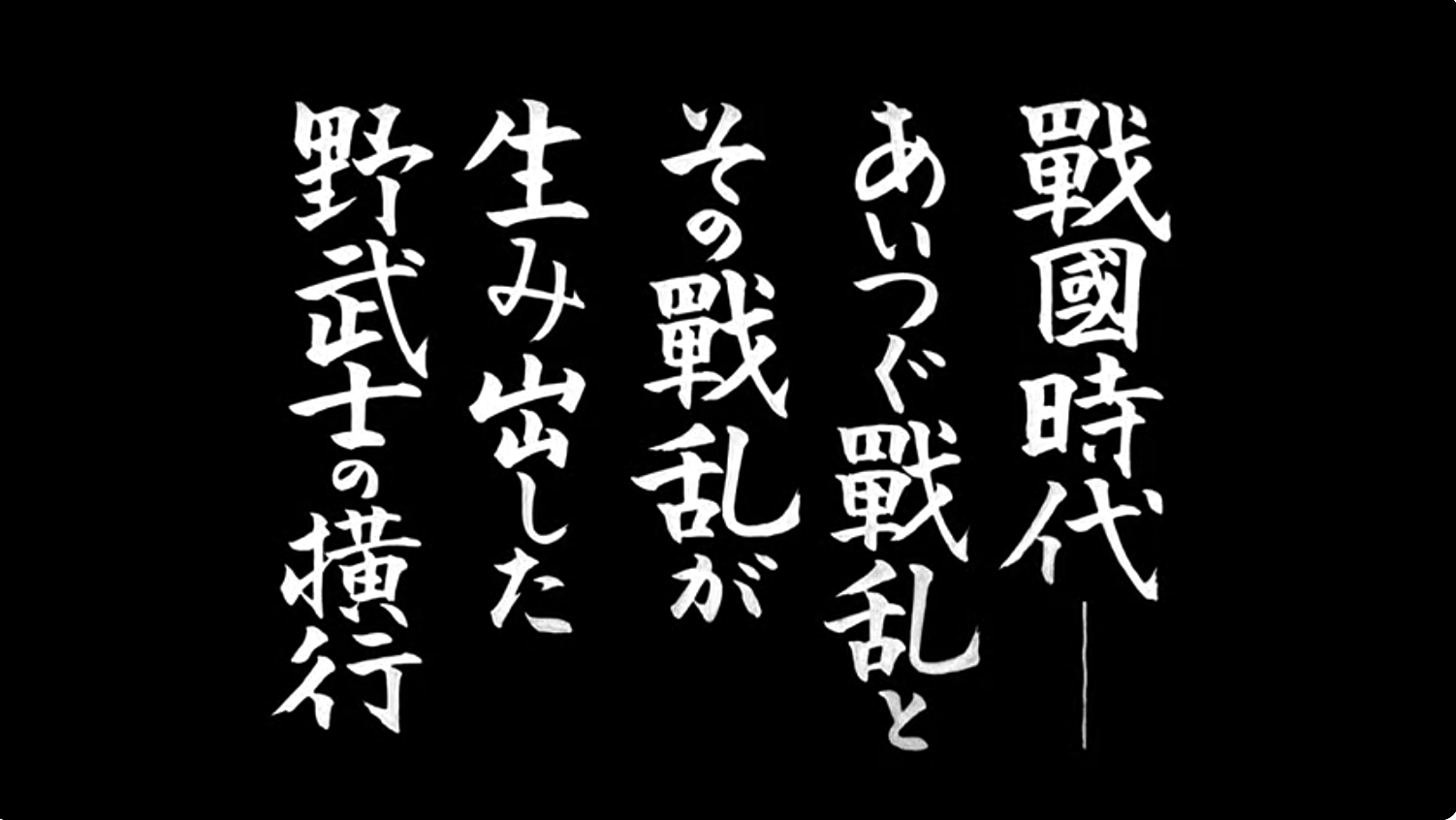 The credits that precede the action on the screen already set up the topsy-turvy nature of the Sengoku period (戦国時代). The “sen” means “war” and “goku” (koku) means country. The Sengoku Period begins in the 15th century and doesn’t end until 1615.
