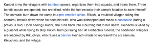 Rikichi’s wife preferred death to a reunion with her husband. Although the current Wikipedia entry for “Seven Samurai” labels her as a “concubine,” which according to Merriam-Webster means either “a woman with whom a man cohabits without being married” or “one having a recognized social status in a household below that of a wife,” but “concubine” this misses the contextual meaning of a woman abducted from her village and husband against her will and forced into sexual slavery. The film makes it clear that Rikichi’s wife isn’t happy with her situation, her husband was helpless to save her and she preferred death to the disgrace and trauma of her life.