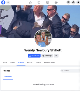 Who is Wendy Newbury Shiflett? And who is her “dear high school friend”? According to her FB page, Wendy Newbury Shiflett has no friends.