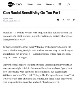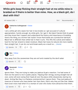 Hair flipping by White women has been a topic of discussion, too. Not only on Quora, but ABC News picked up the story in 2001 (“Can Racial Sensitivity Go Too Far?” 20 July 2011).