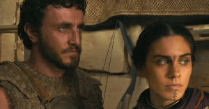 Acacius returns to Rome a war hero, but he serves under a giggling pair of buffoons: brothers Caracalla (Fred Hechinger) and Geta (Joseph Quinn). This twosome are best at parties which feature an up-close-and-personal fight to the death or presiding over increasingly spectacular gladiator games. At one such party, Hanno bests his adversary, adding to the financial woes of the host, Senator Thraex (Tim McInnerny), and revealing his knowledge of Virgil’s “Aeneid.”