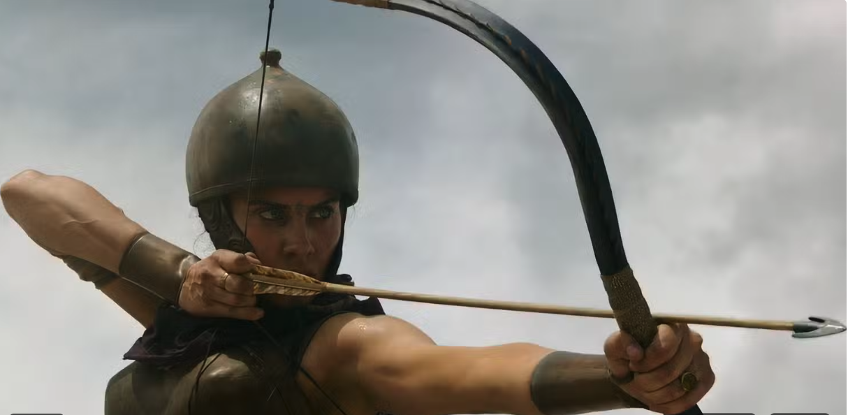 At the heart of this film is a man, Hanno (Paul Mescal), and wife Arishat (Yuval Gonen), living in the North African Numidia (Northeast Algeria). Their fortified city comes under attack by the Roman navy led by General Acacius (Pedro Pascal). Arishat and Hanno are both at the city walls during the battle. Arishat, an archer, shoots and fatally wounds a bestie of the general. Losing his cool, Acacius wrests a bow from one of his soldiers and shoots and kills Arishat, with one arrow. What are the odds amid hoards of other archers? This is eye-rolling plotting. In any case, the city is defeated by the Romans and a bitter Hanno rages to avenge his wife’s death.