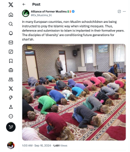 Another tweet from Alliance of Former Muslims claims “In many European countries, non-muslim schoolchildren are being instructed to pray the Islamic way when visiting mosques.”
