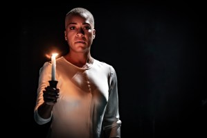 Tennant’s Macbeth is a man seduced by words that eventually delude him into believing himself invincible. He’s a man of wiry power and a bristling bravado. As his wife, Jumbo brings a more solid force of a woman uncertain of her position for she has brought no heir or spare to strengthen her status or assure her future. Clad in white, she isn’t the moral compass but the harbinger of death.