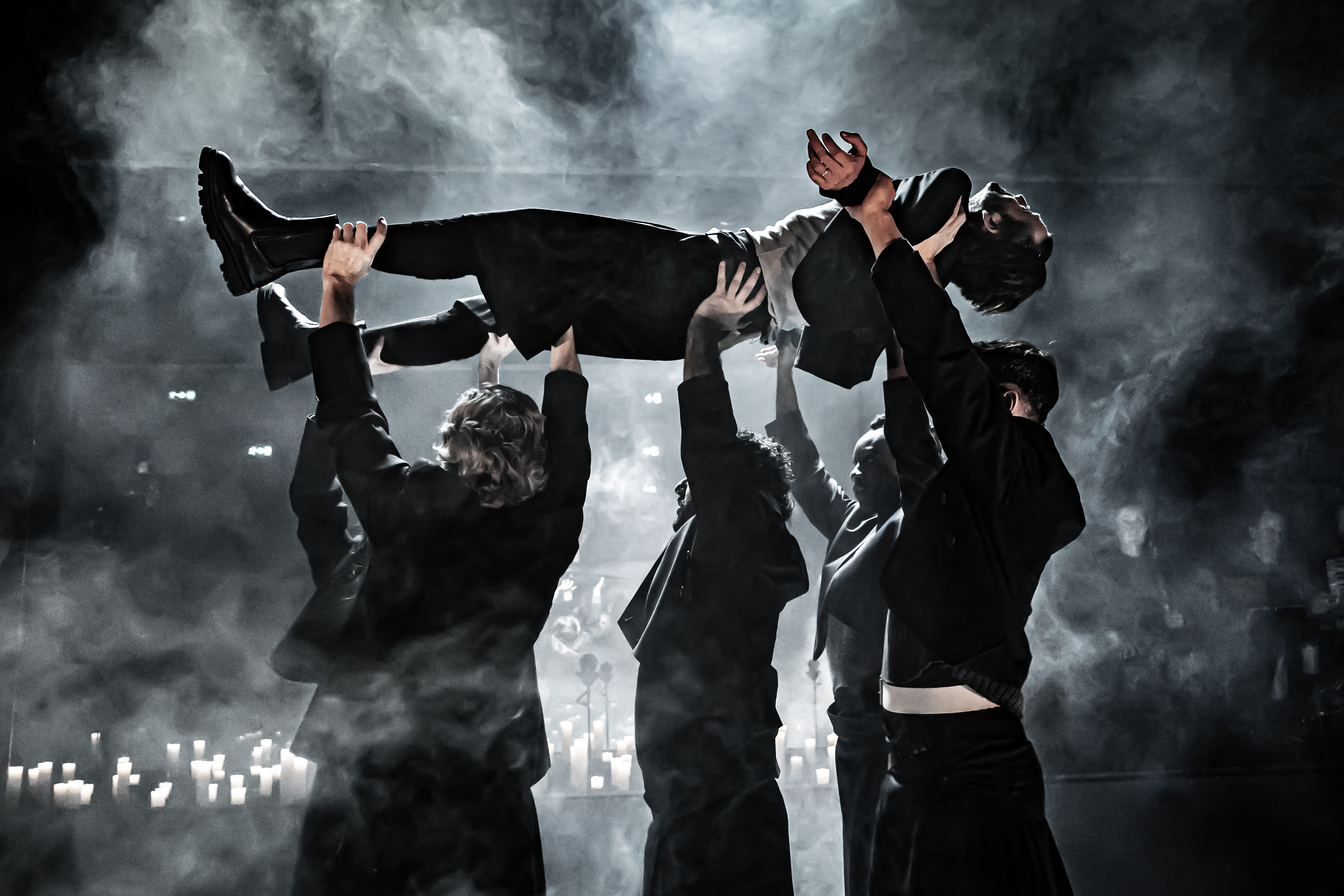 Many of the ensemble play more than one role (e.g. O’Sullivan is Donalbain, a soldier and one of the murdering assassins and a musician). Some of this switching emphasizes the grey morality of the play and the brutality of the times.