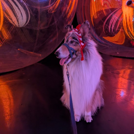 We thought this “dogs allowed” exhibit would be a great opportunity to further socialize our young dogs, Mizore (b. 2 July 2022) and Amazora (b. 26 February 2023). We tried a Friday morning first admission group (11 a.m.).