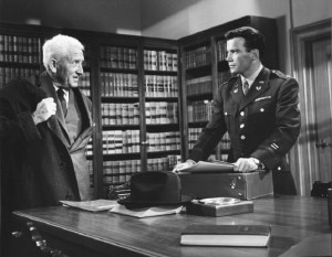 While you might know the name of the stars, you won’t know the names in this fictionalized version of the Judges’ Trials of 1947. In the timeline of this film, the “stars” the Nazi Regime have already been tried and sentenced. Four German judges and prosecutors are accused of crimes against humanity for enforcing the Nuremberg Laws. Because of their senior roles in the Nazi government’s judicial system, they supported and enforced unjust laws and thus bear some responsibility for the European Holocaust. The fictional Chief Trial Judge Dan Haywood (Tracy) is not famous and not even currently a judge, having not been re-elected. He’s a widower without any particularly political prominence. Hayward is embarrassed by the grandeur of his new digs and the formality of the military. He asks Captain Harrison Byers (Shatner) who has been assigned to assist the US judges hearing the case to call him by his first name, Dan, or his occupation, judge.