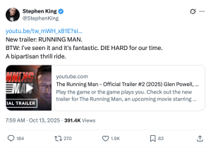 King wrote under the pen name of Richard Bachman and that was before “The Hunger Games” series of young adult dystopian novels were churned out by Suzanne Collins (beginning in 2008 with “The Hunger Games” and now continued with the 2025 “Sunrise on the Reaping”).