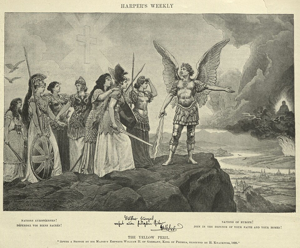 That ignorance is a remnant of anti-Asian sentiments. Look at the infamous illustration from Kaiser Wilhelm II to the Russian Tsar Nicholas II. Known as “Peoples of Europe, Preserve your most sacred goods! (Völker Europas, wahret eure heiligsten Güter!), the picture by Hermann Knackfuß depicts the Archangel Michael surrounded by female personifications of France (Marianne), German (Germania), Russia (Mother Ussia), Austria-Hungary (Austria), Italy (Italia Turrita) and Great Britain (Britannia).
