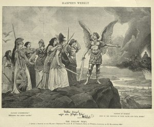 Buddha (who was born and lived in India) is shown hovering within dark clouds on the horizon. The Yellow Peril was the pagan Buddhism. The illustration was made in 1895 when Yellow Perilism was already part of the US legal system with the Chinese Exclusion Act of 1882. There would be an additional anti-Asian immigration legislation known as the Johnson-Reed Immigration Act of 1924. The Immigration Act of 1924 banned immigration from Japan and other Asian countries. Canada passed its Chinese Exclusion Act in 1923. Canada also had the Gentlemen’s Agreement of 1908, an informal pact that limited Japanese immigration to male laborers.